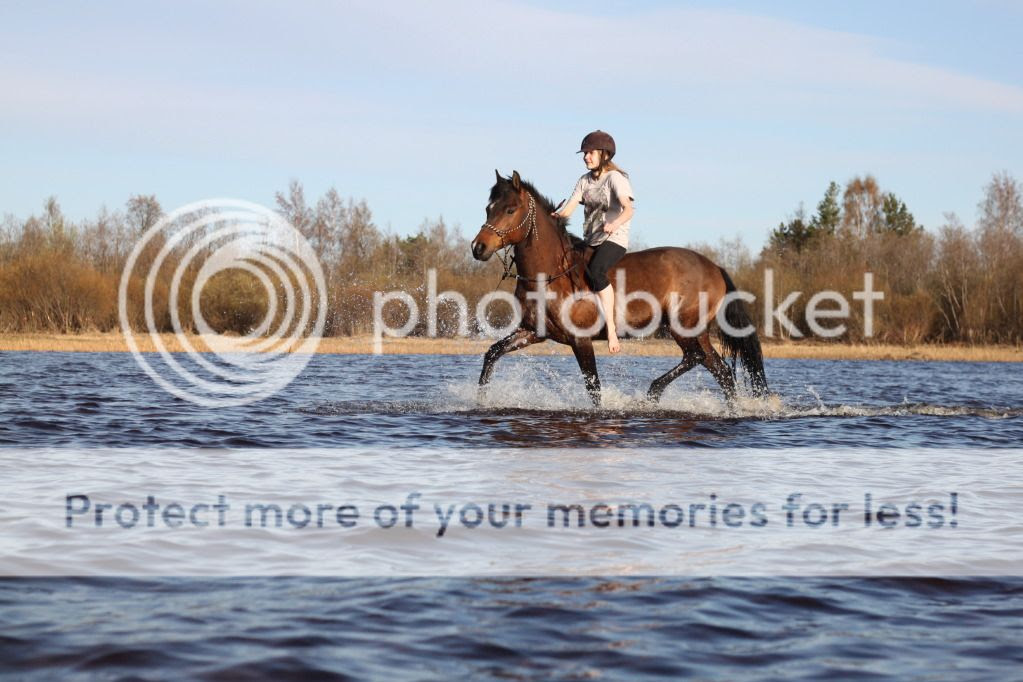 Tänään/eilen/lauantaina taas kävimme Ellin & Aden ja Ellan & Papin kanssa samaisessa lammikossa uittamassa sorkkia, Veeran kuvatessa tätä hullua porukkaa. Vähän enempi piti jutella ponille, että onko sinne veteen pakko mennä -siellähän oli aaltoja!! Poni kuitenkin sinne uskaltautui, eikä taaskaan ehtinyt rantaan saakka vaikka laukkasimmekin astetta kovempaa vauhtia rantaa päin ja jarruissa oli vikaa, pahasti. Kaikin puolin mukava reissu kuitenkin, takaisin tallille mennessä Veera loikkasikin Aatun sijaan Koon kyytiin ja A & P menivät edeltä talliin. Ensiksi poni ilmeisesti luuli jäävänsä sapelihammastikrun saaliiksi, mutta vähitellen rauhoittui ja metsässä kulki rentona ja pää alhaalla, lähes täydellisesti toimivilla jarruilla! Ihana poni. Poni pääsikin pikkutarhaan vihreälle, ja on siellä itse asiassa edelleen enkä ajatellut hakea enää talliin yöksi. Toivottavasti se on vielä aidoissa, tai korkeintaan viereisellä pellolla eikä pitkin kyliä juoksemassa...