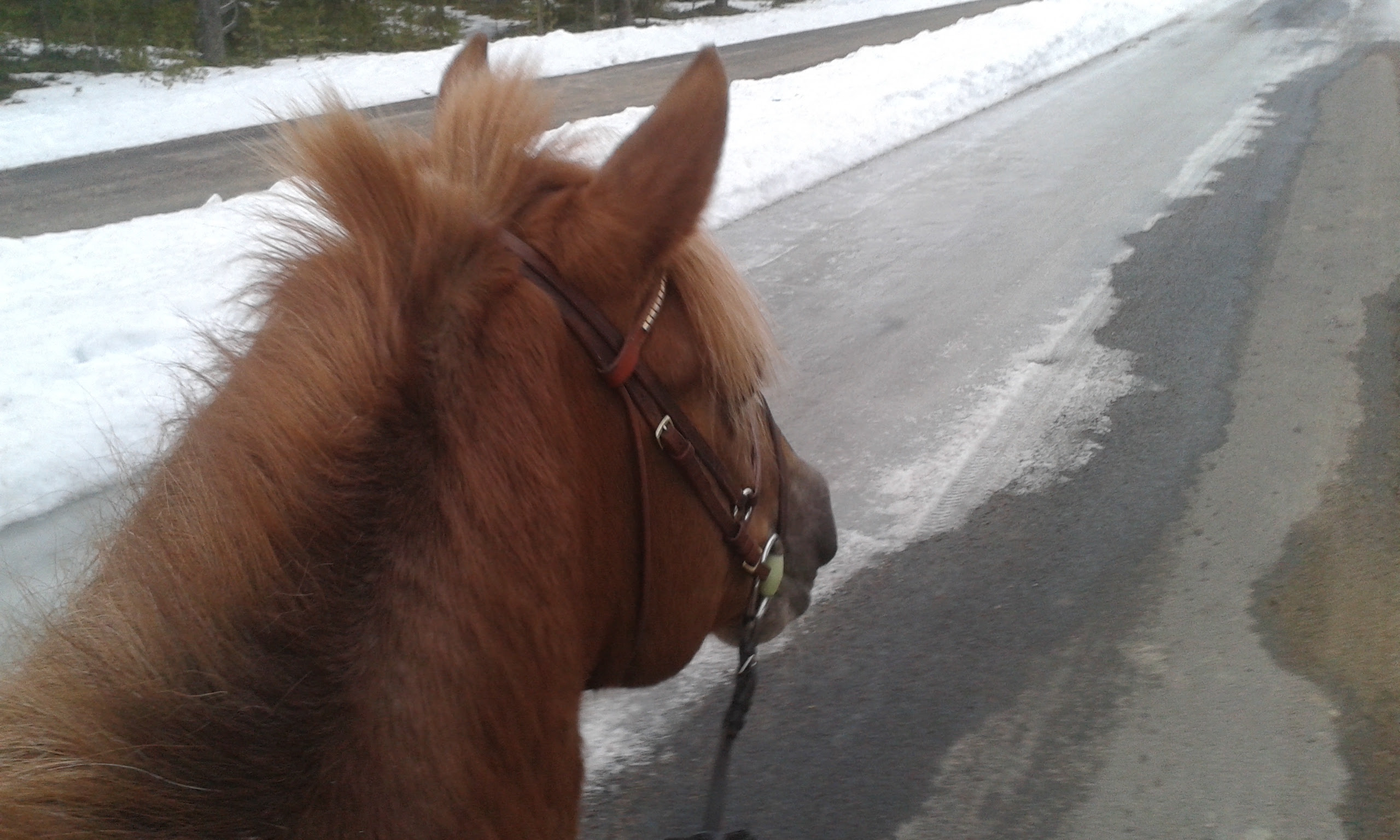 Seuraava selästäkäsinkipityslenkki olikin nyt perjantaina. Matkaan lähdimme vähän kahdentoista jälkeen, ja ihmettelin varsin outoa valoa; aurinkoista mutta sykempää, ja värit olivat voimakkaita. Muisti alkoi vähitellen palata ja muistin, että auringonpimennyshän se. Liekö syynä kyseinen ilmiö vai mikä, mutta Maila oli rauhallinen. Niin rauhallinen, että sydän kurkussa loikkasin selästä ja talutin maisemia ihailevan ja kuusenoksia napsivan, sekä puhtaasti ja mielellään kävelevän, puten talliin. Kamalaa kun tuolla lailla säikäyttelee! Tallissakaan kintuissa ei ollut mitään, kylmäyksenkin jälkeen jalat olivat yhtä kuivat ja viileät kuin normaalisti.