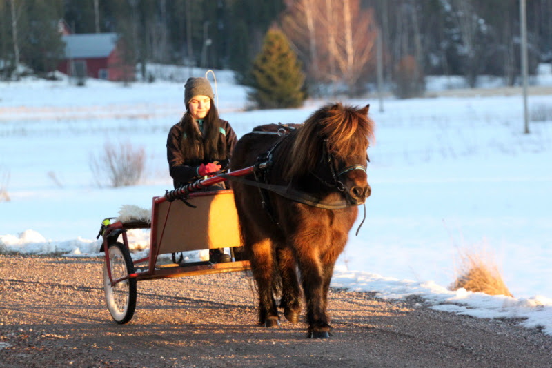 Eilen kävimme Koon kanssa, jälleen ohjeiden mukaan, kävelemässä. Matkaa kertyi vähän vajaa seitsemän kilometriä, johon kulutimme aikaa puolisentoista tuntia useine kuvaustaukoineen. Muutaman alamäen kohdalla pysähdyimme ja peruutimme takaisin ylös, montaa toistoa ei tarvinnut muistutella kun poni jo kaivoi kovalevyltään vanhan opin, että pakilla kuljetaan selkä ylhäällä ja koko kroppa pyöreänä. Itse istuin vain kyydissä ja nautin maisemista, kunnes ponin vessatauko pakotti hyppäämään alas potkimaan kasan ojaan ja talutin loppumatkan tallille.